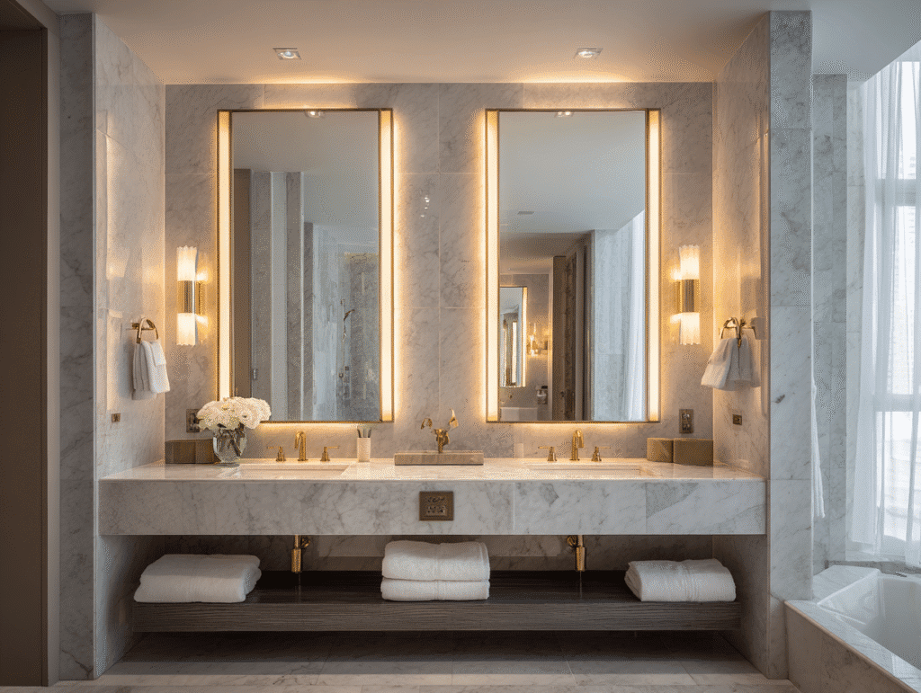 욕실 거울 옆 양옆으로 조명 배치하면 그림자도 덜하고 인상도 부드럽게 잡힌다. 천장엔 확산형 매입등으로 눈부심 없게 하면 더 좋다.